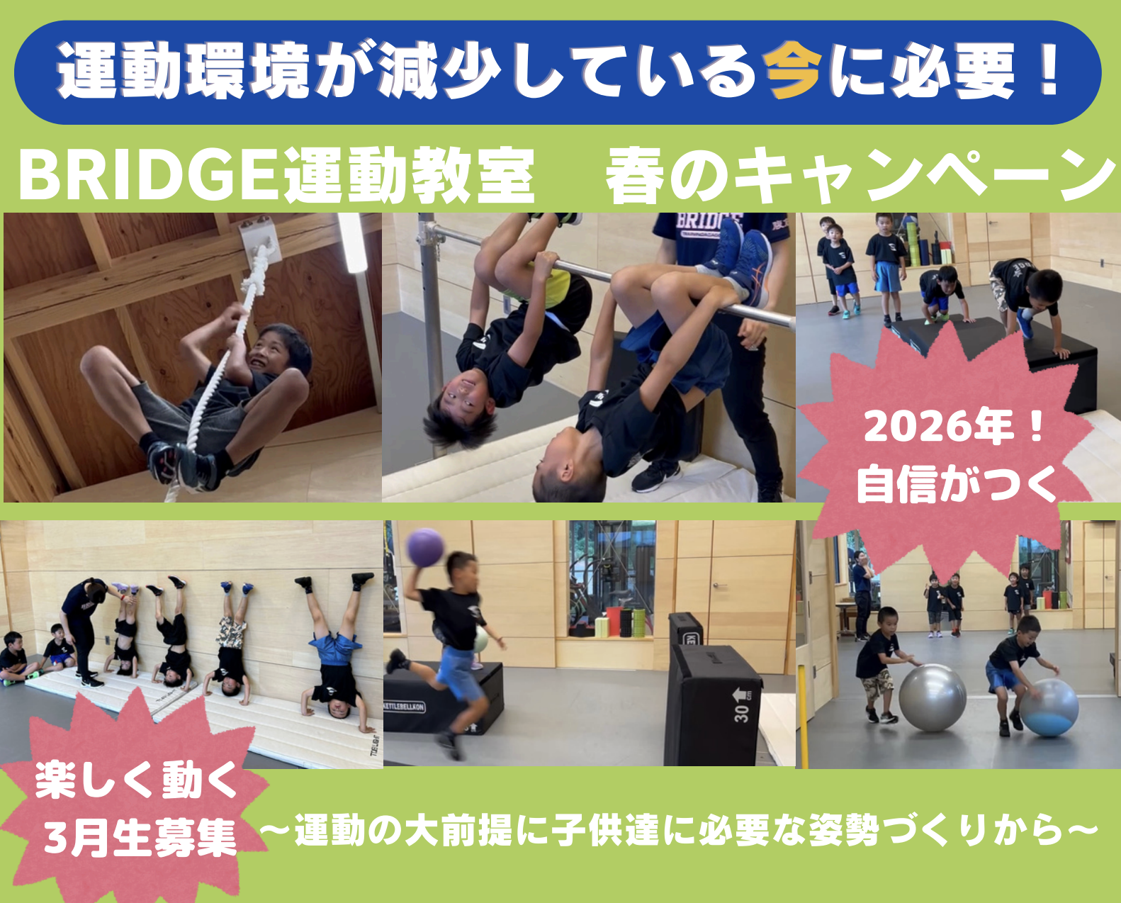 また大切になるのが、「考える力」を養っていく時期になりますので『心・技・体・生活(考える力)』を学んでいきます!この年代からクラブ活動や行いたいスポーツが出てきますので、その競技の土台となる動きを獲得していきます。